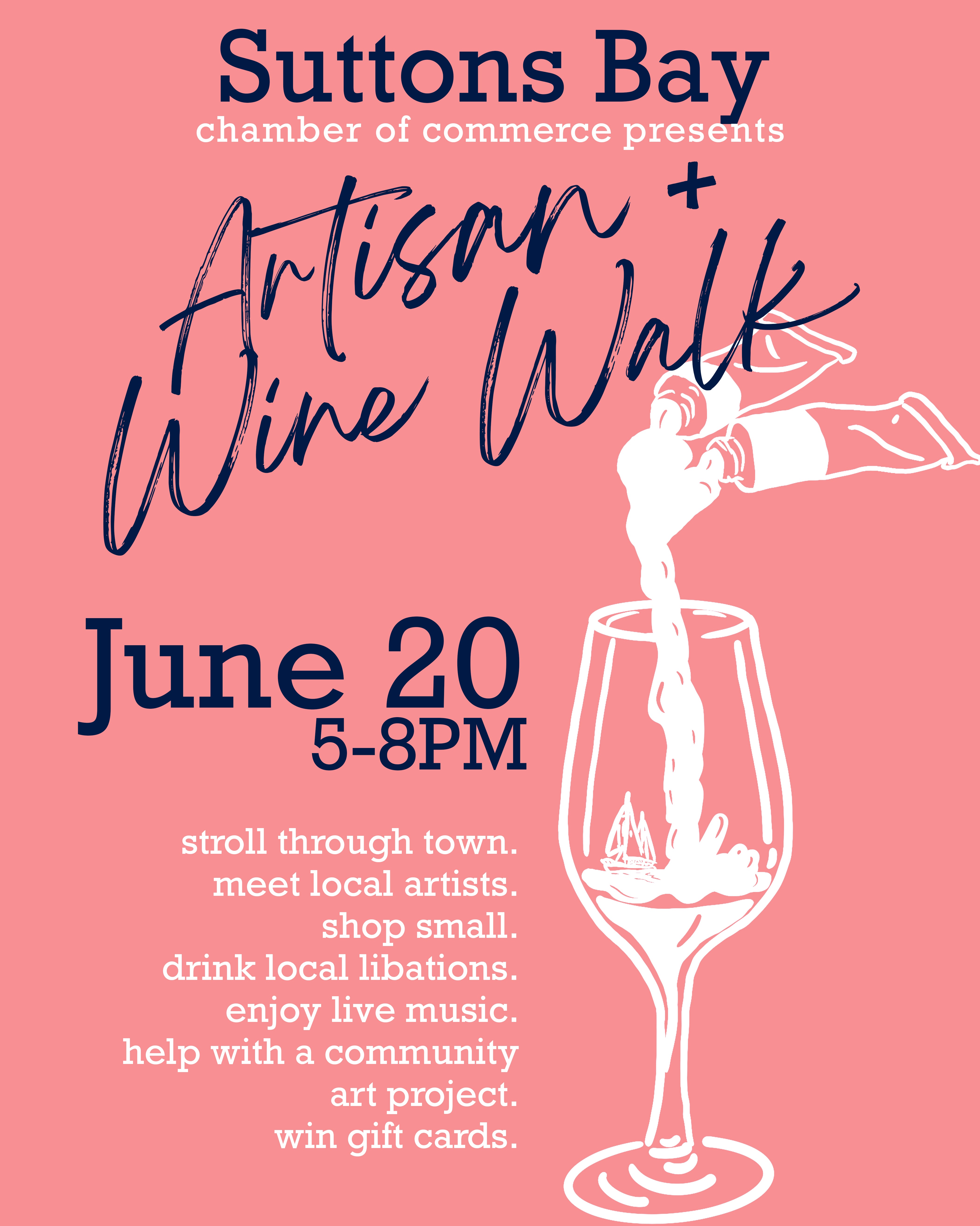 Join us in beautiful Suttons Bay for our Annual Summer Kickoff Artisan & Wine Walk! This beloved evening event is the perfect way to welcome the season—stroll through town, explore unique local shops, meet talented artists, and sip on delicious wines, ciders, and brews from right here in Leelanau County. Enjoy the live music throughout town and participate in a variety of activities, including a community art project!